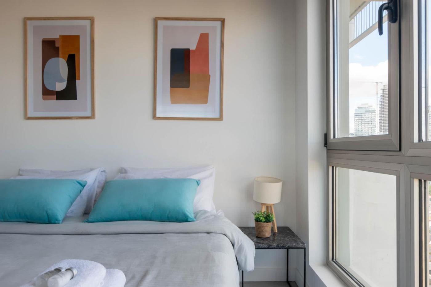 El apartamento tiene 1 dormitorio, 1 baño, ropa de cama, toallas, TV, cocina totalmente equipada y patio con vistas a la ciudad.